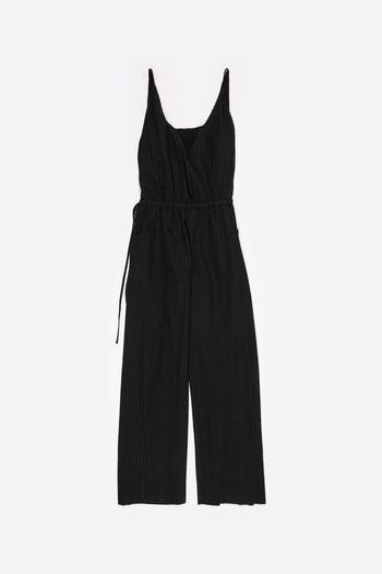 Long jumpsuit with an adjustable waist seam. Features a plunging cross-over V-neck with straps, saddlebag pockets, and a gathered inner top.