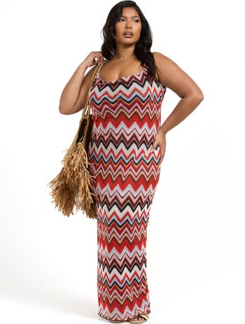 FASHION-SZN CURVE Strapy Retro Print Mesh Maxi Dress, Alternate, color, Brown