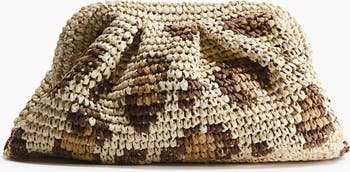 Clutch in braided paper straw and glittery threads featuring a covered metal frame with a concealed magnetic fastening at the top. Lined. Depth 11 cm. Height 16 cm. Width 29 cm.
