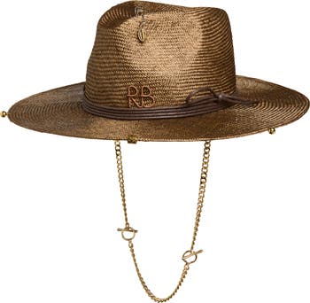 This statement-making fedora is crafted from natural, coppery straw with a pinched crown and wide brim wrapped with waxed cording. Piercings and a cowrie safety pin embellish the style, while a removable golden chain strap with toggles drapes at the neckline.