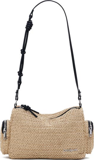 Exterior zip pockets lend extra organization to this softly structured shoulder bag made from woven straw.