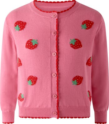 Sweet and playful with a touch of classic charm, the Strawberry Cardigan is a delightful layering piece for any season. Beautifully knitted in soft cotton, this cozy cardigan features an all-over strawberry motif set against a cheerful pink base, bringing a fun and whimsical feel to everyday outfits.