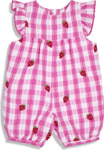 Strawberry Embroidered Gingham Cotton Seersucker Romper