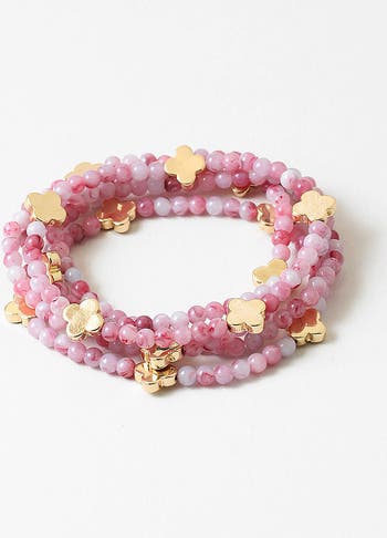 A dreamy mix of soft strawberry pinks and creamy blush tones, the Strawberry Fields Forever Bracelet Stack is finished with gleaming gold lucky clover beads for a touch of charm. Designed on a comfortable stretch cord, each bracelet is easy to slip on and perfect for stacking—adding a sweet pop of color and shine to your everyday look. Great for every age and perfect to wear solo or mix and match!