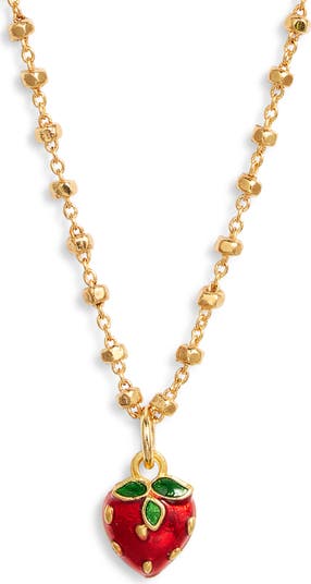 An enameled strawberry pendant sweetens a necklace plated in 18-karat gold and stationed with faceted beads.