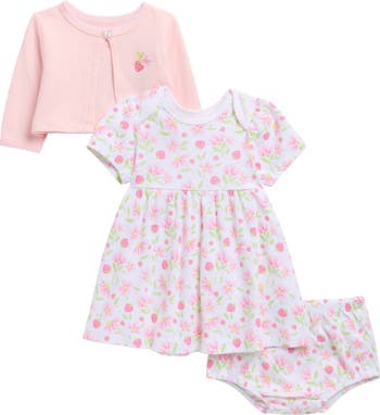 Have your phone ready to snap baby in this sweet cotton-knit set that includes a dress, cardigan and matching bloomers.