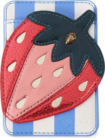 The brand's signature eagle head stares out from a juicy strawberry on a striped card case that attaches easily to the back of your phone.
