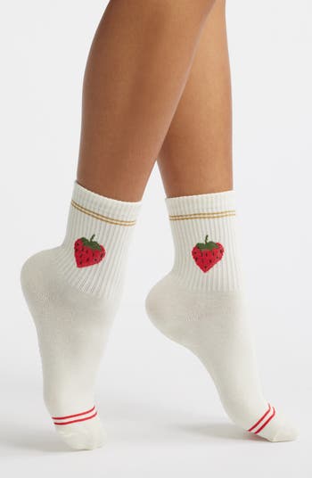 Treat your feet to some fresh, fruity fun with these cotton-rich socks, where sparkly varsity stripes and sweet strawberries make a winning pair. Nonslip rubber grips keep you grounded with every step.