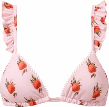 Indulge in the sweetest blend of charm and style with this pink bikini top. Featuring delicate ruffle straps and eyelet lace trim, it’s finished with our custom hand-drawn strawberry print for a whimsical, standout touch.
