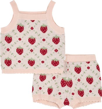 Summer days will be even sweeter with this strawberry-pattern set in their collection made from organic cotton yarns for breathable comfort.