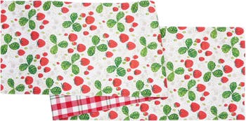 Featuring artwork by Lucinda Wei, the Strawberry Patch & Plaid printed table linen collection showcases vibrant strawberry plants with intricate crowns and cute botanical leaves, blossoming throughout the pattern. For versatility, the reverse side offers a summertime red and green plaid design, providing more styling options or a classic picnic-inspired look.