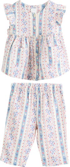 Sweet ruffles and a vintage-inspired strawberry print emphasize the retro vibe of this baby-sized set featuring an all-cotton babydoll top and a pair of matching pants.