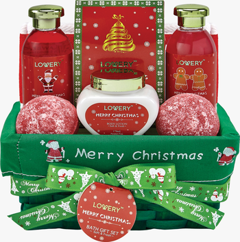 Deluxe 8 piece set - this spa xmas gift basket has everything a woman needs! It includes shower gel, bubble bath, body lotion, bath salt, 2 bath bombs and a loofa back scrubber. Packed in a stunningly wrapped christmas box, it also has a gift note card for you to personalize it.