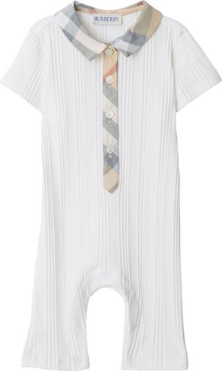 A playsuit in a ribbed stretch cotton jersey, woven with the Burberry Check at the point collar and placket.||Button closure|Press-stud gusset