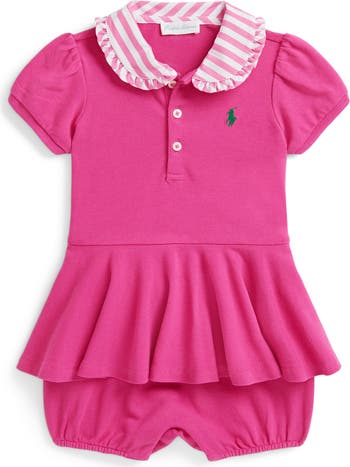 A cozy stretch-cotton shortall is playfully styled with a striped ruffle-trim collar, peplum hem, and snug elasticated shorts.