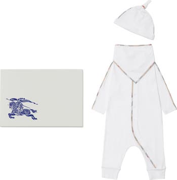 A three-piece baby gift set in stretch cotton including a hat, bandana bib and jumpsuit with Peter Pan collar. The designs are edged with Burberry Check piping.||Jumpsuit: press-stud closure, integrated scratch-mitt cuffs and booties for sizes 1-9m|Bib: press-stud closure|Presented in an elegant Burberry gift box|This product is not intended as sleepwear.