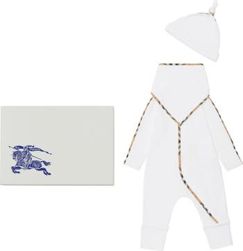 A three-piece baby gift set in stretch cotton including a hat, bandana bib and jumpsuit with Peter Pan collar. The designs are edged with Burberry Check piping in signature sand beige.||Jumpsuit: press-stud closure, integrated scratch-mitt cuffs and booties for sizes 1-9m|Bib: press-stud closure|Presented in a Burberry gift box|This product is not intended as sleepwear.