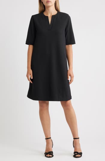 A split collar and elbow-length sleeves frame this comfortable stretch-crepe trapeze dress that's perfected by handy pockets.