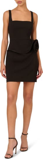 A modern statement with artful dimension, this stretch-crepe minidress is designed with a sleek square neckline and sleeveless silhouette. A sculptural peplum defines the waist, while a 3D rosette at the hip adds striking visual interest. Fitted and flattering, it's a standout look for events that call for something unexpected.