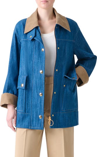 This elevated-take on a classic utility jacket is crafted from medium-wash stretch denim and completed with corduroy trim at the collar and cuffs.