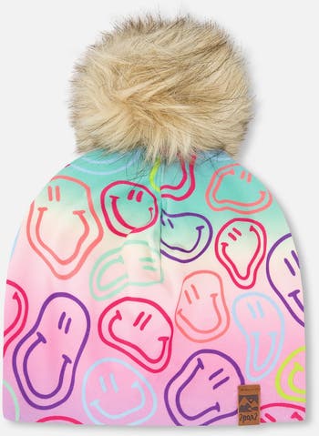 The jersey hat multicolored printed smileys with pompom brings a playful pop to breezy spring days. Softness meets stretch in the lightweight jersey hat for a comfy, stay-put fit that gently hugs the head. Topped with a fluffy removable pompom, an allover print, and made for outings, stroller rides, and playground fun, it’s an easy layer for milder weather in our “Spring Breeze” collection.