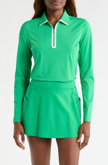 Contrast trim sharpens the collar and quarter zip of this stretch jersey polo designed for polished, sporty wear.