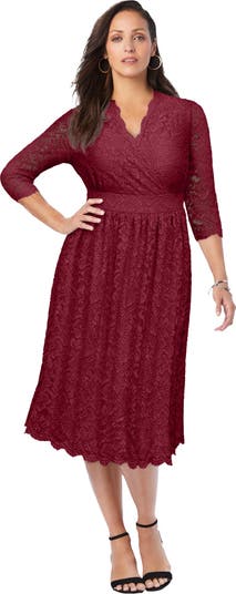 This head-turning silhouette features a figure-flattering surplice V-neckline, A-line shape and sheer sleeves, plus delicate scalloped edges on the sleeves and neckline. Add this easy-care, easy-wear dress to your wardrobe for date nights and formal events.