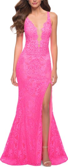 Long neon lace gown with deep plunging neckline and leg slit. Sheer bodice and V back with keyhole. Back zipper closure.