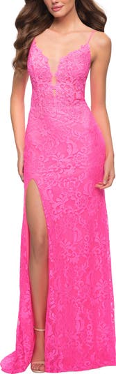 Neon stretch lace gown with sheer bodice and plunging neckline. Features rhinestones throughout, a leg slit and a criss cross clasp open back. Back zipper closure.