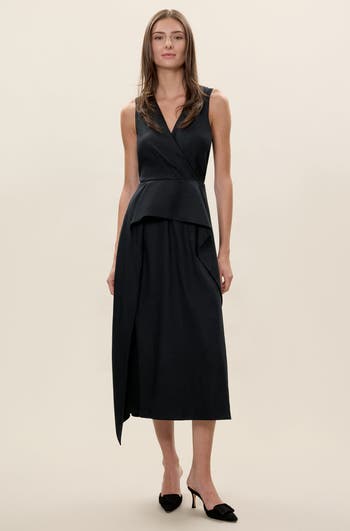 A refined stretch linen silhouette featuring an elegant V-neckline and flattering peplum waist detail. The tea length creates graceful movement while the classic black hue adds timeless sophistication. This versatile piece combines natural linen breathability with gentle stretch for effortless elegance and comfortable wear.
