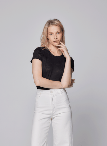 This short sleeve crewneck features a soft buttery hand and a fitted silhouette. Our linen elastane blend is made from European long stem line with a unique finish that is cool to the touch and will never pill, stretch, fade, or wrinkle. Handcrafted from the finest French materials in Paris and produced exclusively in Europe.