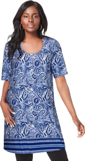 Our mega tunic gets mega comfortable in a cozy rayon knit. The scoop-neck pullover silhouette features elbow sleeves and generous side slits for true coverage and an easy fit.