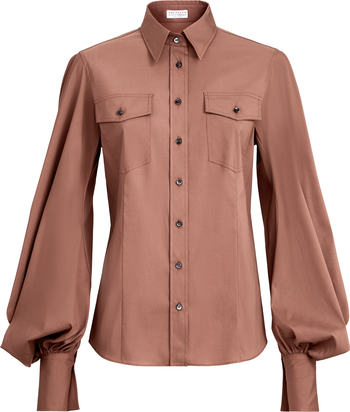 - Classic collarTwo patch chest pockets with flap and buttonCuffs have one mother of pearl buttonBalloon sleeveNickel-free monili decoration