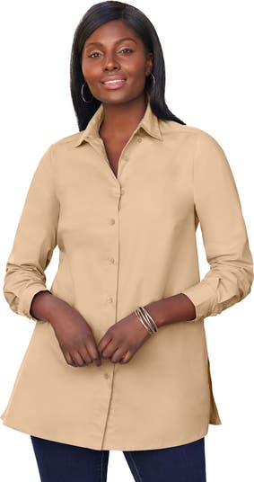 Polished tunic with button front and shirt collar. Slight A-line silhouette. 7" side slits.