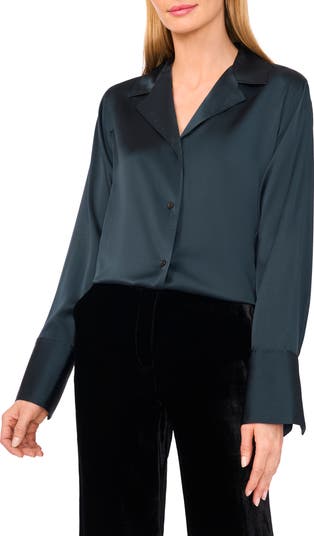 Go for the gloss of a lustrous satin shirt set with gently flared sleeve cuffs for extra style points.