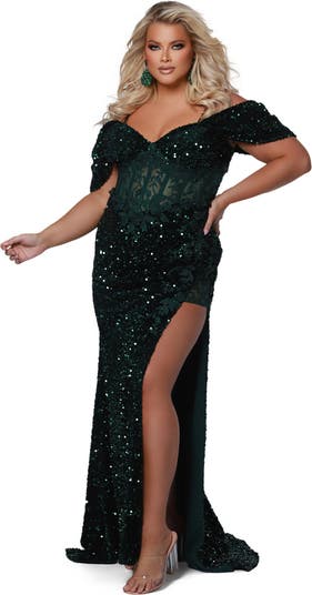 Stretch Sequin Velvet Off the Shoulder Plus Size Evening Gown
