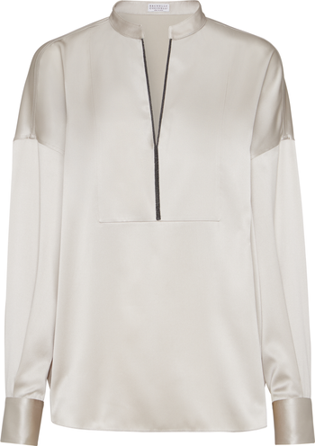 Stretch silk satin, an elegant fabric with a shiny effect and flowing hand, represents a classic of Brunello Cucinelli fine materials. A small amount of synthetic fiber adds to wearer comfort.