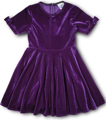 Rich and elegant, this dress is crafted from luxurious purple stretch velvet with a soft drape and beautiful sheen. A full circle skirt gives it graceful movement, while elbow-length sleeves are finished with sweet velvet bows for a festive touch. A back tie ensures a perfect fit, and a back zipper makes dressing easy. Designed to fall at the knee, it’s a picture-perfect choice for holiday portraits, family gatherings, and special celebrations. Purple stretch velvet, 93% polyester 7% spandex, full circle skirt, elbow-length sleeves with bows, back zipper, back tie, knee length.