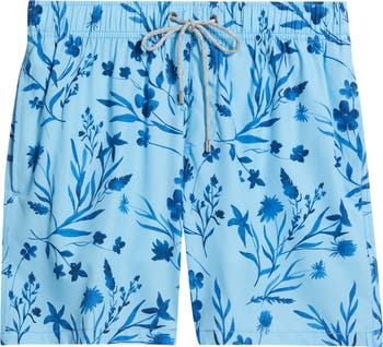 A stretchy elastic/drawstring waist keeps you comfortable all day in these swim trunks made with handy pockets.