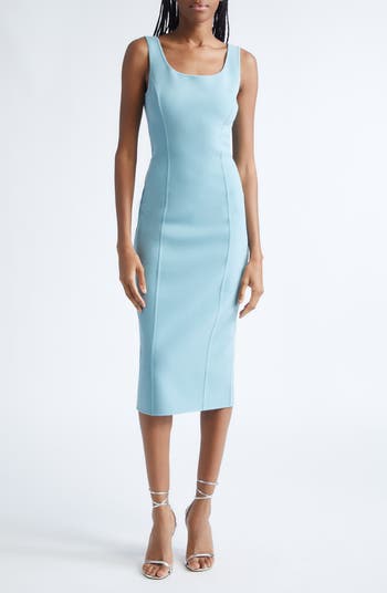 This lovely seaglass-blue sheath dress is crafted in Italy from textural double-face crepe woven from virgin wool enhanced with a touch of stretch.