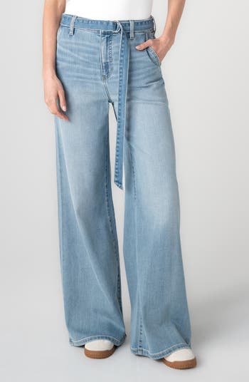 A D-ring belt elevates the style of these faded, nicely draped jeans made with a superhigh waist, slanted front pockets and floor-grazing wide legs.