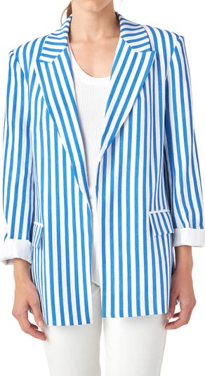 Vivid stripes embolden this day-to-night blazer designed with an open front and padded shoulders.