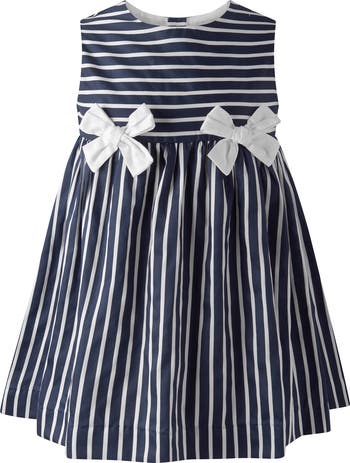 Classic, coastal, and beautifully timeless, this Navy Stripe Bow Resort Dress is a refined take on warm-weather dressing. Designed in London, it features crisp navy-and-white stripes paired with delicate bow detailing at the waist, blending nautical charm with Rachel Riley’s signature elegance. The sleeveless bodice and softly gathered skirt create a graceful silhouette that feels polished yet effortlessly wearable.