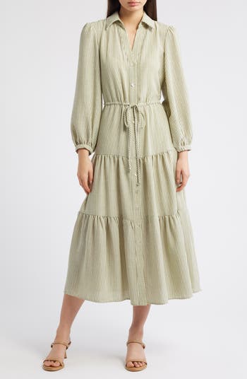 Bracelet-length sleeves frame this tiered shirtdress that's patterned in stripes and cinched by an adjustable waist tie.