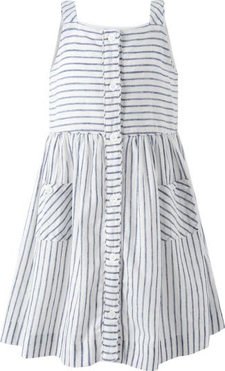 A light, effortless sundress designed for warm days, long weekends, and sunshine-filled travel. This Girls’ Stripe Button-Front Sundress captures the relaxed polish of coastal holiday dressing with a tailored bodice, full gathered skirt, and an all-over vertical stripe that feels crisp, nautical, and timeless.