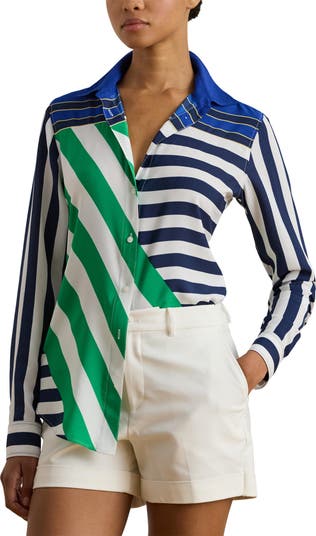 Mixed-direction, multi-colored stripes refresh this classic button-up blouse cut in a relaxed silhouette for timeless sophistication.