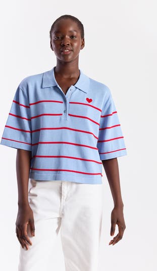 Soft knit, relaxed cropped silhouette, breezy drape, striped detailing and a subtle heart emblem, designed for carefree weekend confidence.
