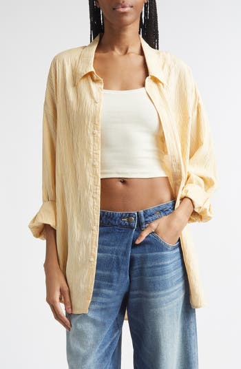 Chris Leba's rebellious vision shines through the artfully crinkled texture and oversized silhouette of this slouchy-cool button-up streaked with suiting-inspired pinstripes.