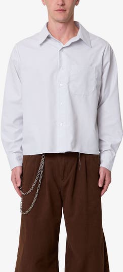 An enzyme-washed finished and raw hem relax the stance of the classic button-up in this boxy style cut from smooth cotton with natty pinstripes.