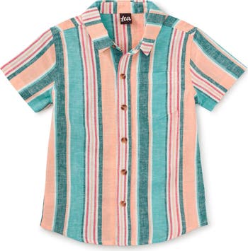 Dressy and fun, this striped button up shirt is crafted of a breathable and lightweight linen/cotton blend. Our in-house designers took care to create the perfect short-sleeve summertime shirt loaded with special detailing like a chest patch pocket, center front button closure, and a spare button. Paired with our shorts, your little one will be instantly ready for play and parties. Thigh length.